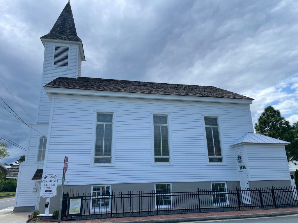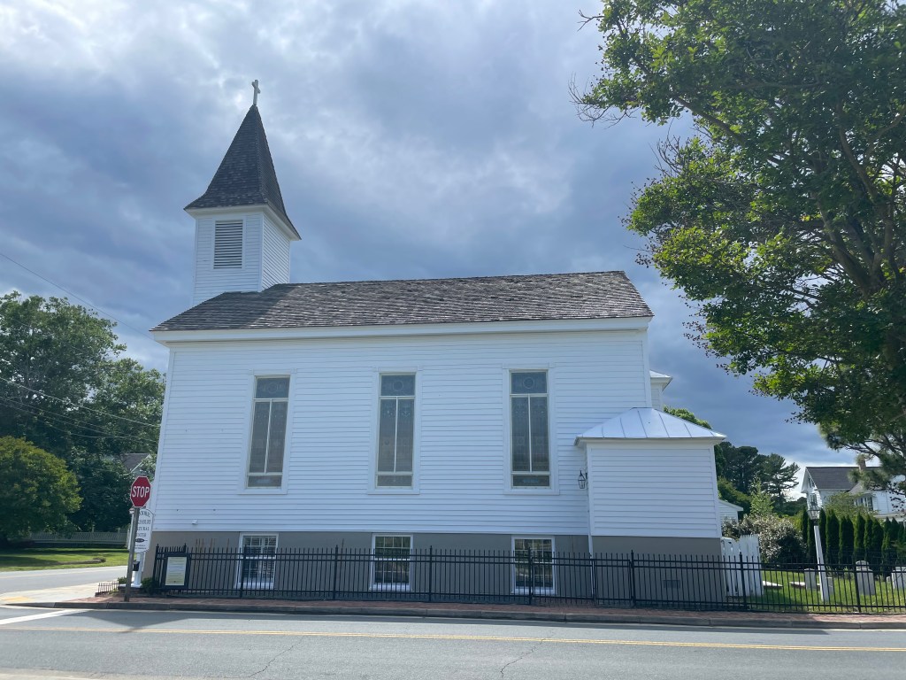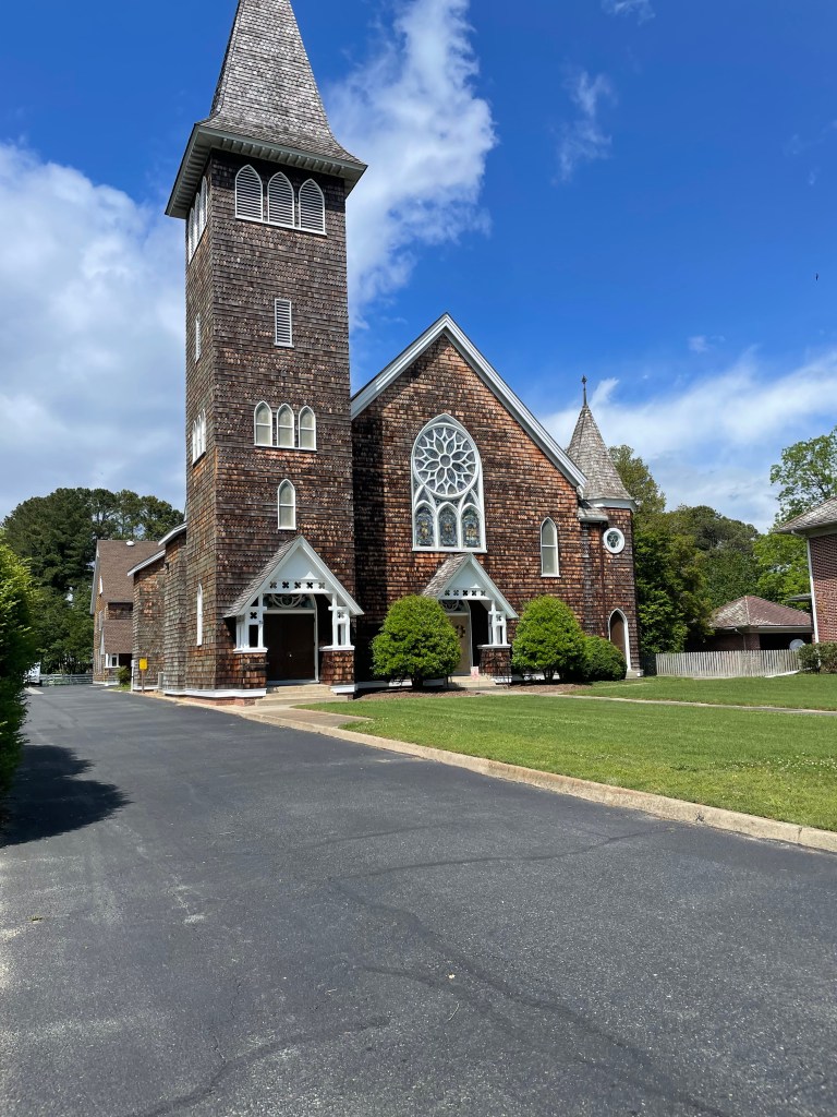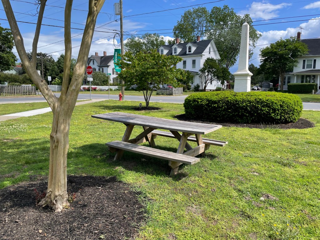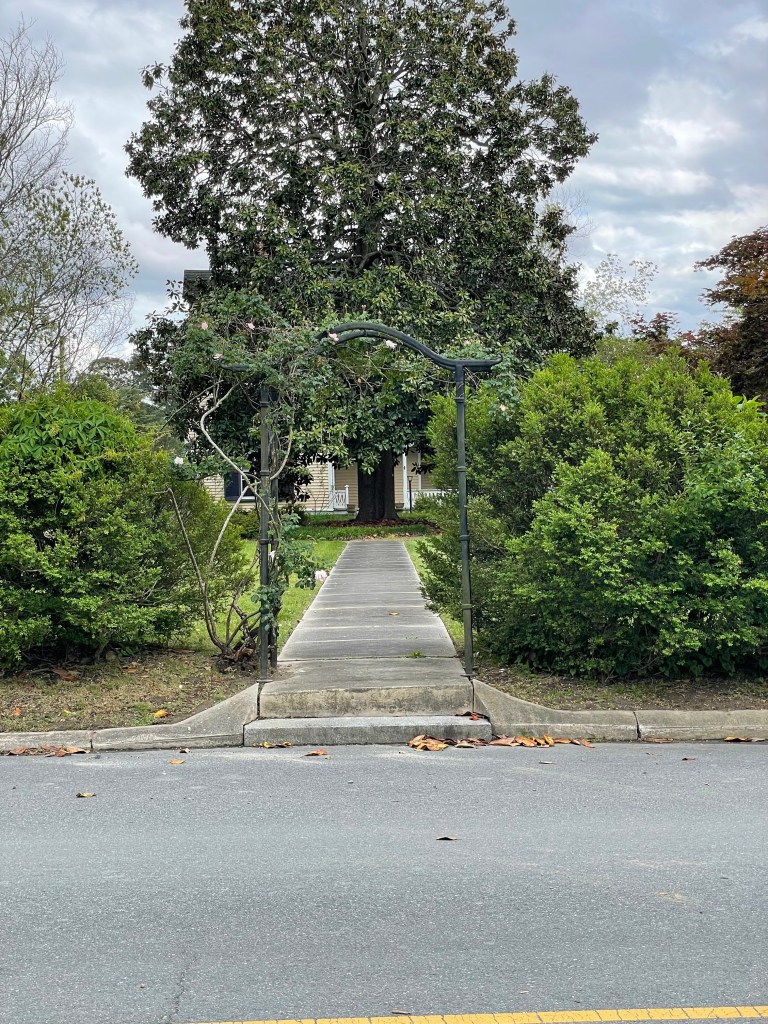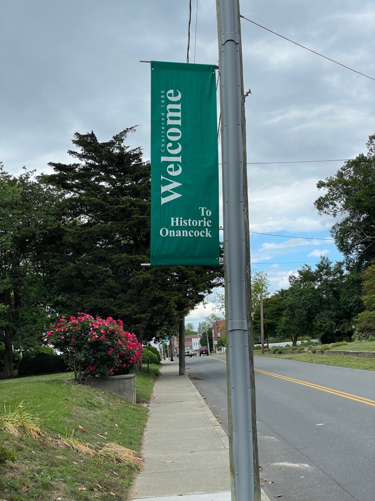 We arrived at Onancock about 2:00 p.m., anchored at N37°42.64′ W075°45.49, and went for a walk around town. It is a very quaint town with a lot of pretty homes and beautiful roses everywhere. We stopped in at Mallards on the Wharf, https://eatatmallards.com/, for some drinks and snacks. Bill had a big crab cake ball, and I ordered crab bread because it reminded me of an appetizer that my mother used to make — yummy! Bill and Jill invited us over to Seahorse for fajitas, which were delicious (we owe them a few dinners!).